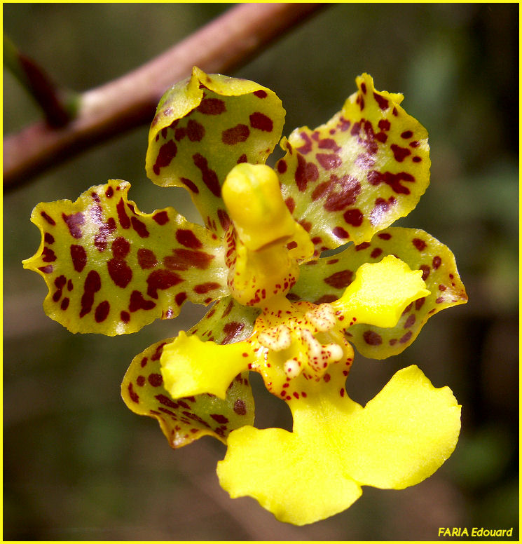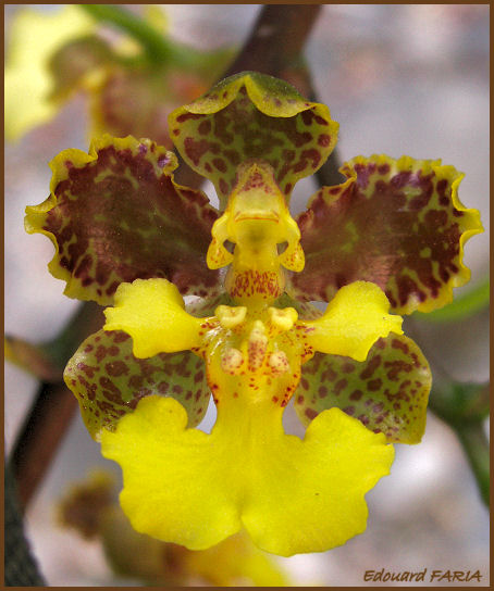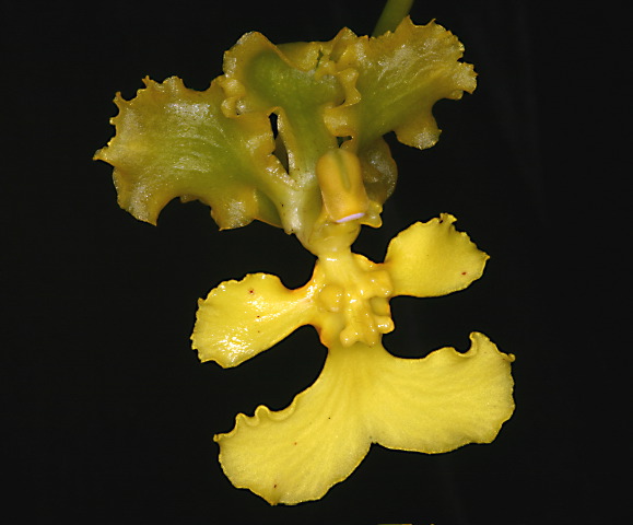 This is a medium sized, mule ear Oncidium that is found from Mexico to Honduras at altitudes up to 2800 meters as a cool to warm growing epiphyte with very small pseudobulbs that are enveloped by several scarious, distichous sheaths and carring a single, apical, erect, broadly lanceolate or elliptic, fleshy coriaceous, acute or subobtuse, gradually narrows below into the conduplicate base leaf that blooms in the winter and early spring with an erect, to 3' [90 cm] long, branched, many flowered panicle arising on a newly matured pseudobulb with showy, waxy, fragrant flowers.