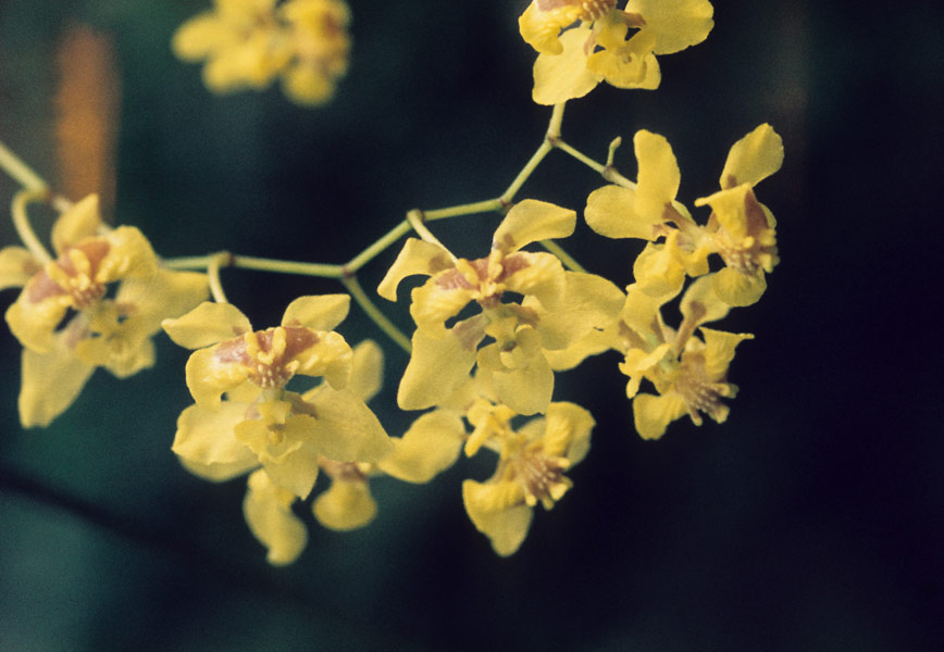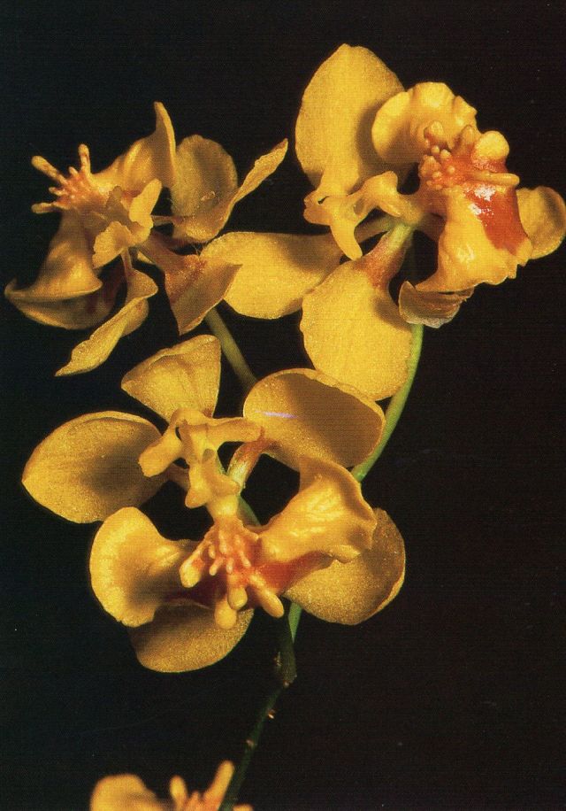 Found in Ecuador and Peru at elevations around 1800 to 2100 meters as a small sized, cool to cold growing epiphyte with ovate to elliptical, laterally compressed, ancipitous pseudobulbs enveloped basally by 2 pairs of foliaceous sheaths and carrying 2 to 3, apical, conduplicate, lanceolate, acute leaves that blooms on a 17 to 40" [42 to 100 cm] long, ascending to erect then nodding, paniculate, central stem fractiflex, 5 to 8 branched, rebranching, all in the apical 1/3, each branch 6 to 12 flowered, many flowered inflorescence.
