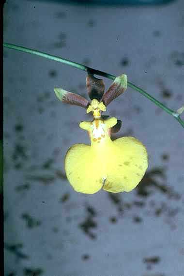 Found in Durango and Sinaloa states of Mexico in pine/oak forests at elevations of 1600 to 2134 meters near Corralitos, on oaks as a small sized, cool to cold growing epiphyte with apple-green, ovate, laterally compressed, ancipitous pseudobulbs partially enveloped by 3 to 5, distichous, imbricating sheaths with the uppermost 3 being leaf-bearing and carrying 2 or 3, apical, arching, linear to strap-shaped, acute, keeled ventrally, slightly leathery, conduplicate below into the base leaves that blooms in the late fall and winter on an axillary, erect to arching, paniculate, to 4 simple branched, 30" [75 cm] long, several flowered inflorescence arising on a newly matured pseudobulb with slightly fragrant flowers.