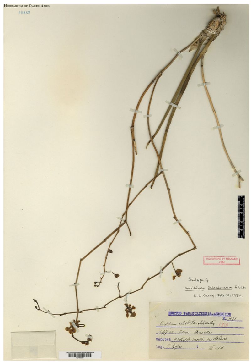 References W3 Tropicos, Kew Monocot list , IPNI ; Das Pflanzenreich Odontoglossum/Oncidium Kranzlin 1922 as O glaziovii; Schlechteriana Vol 1 No 4 1991 as O cebolleta var purum photo fide; Harvard Papers in Botany Vol 21 #2 Cetzal-Ix Carnevalli and Romero-Gonzalez 2016 Synopsis of the Trichocentrum Clade as Cohniella cepula photo fide; LANKESTERIANA 19(2).125 - 193 Ossenbach & Jenny 2019 as O ostenianum collection sheet fide;