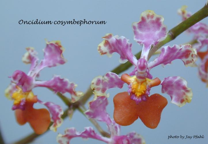 References W3 Tropicos, Kew Monocot list , IPNI ; Das Pflanzanreich Regni Vegetabilis Conspectus Odontoglossum/Oncidium Kranzlin 1922 as Oncidium guttatum var morrenii; Orchid Species Culture: Oncidium, Bakers 2006; Oncidium Vol 2 Koniger 2005; The Pictoral Encyclopedia of Oncidium Zelenko 2002 as Trichocentrum cosymbephora; Guia de Orquideas de Chiapas Carlos Rommel Beutelspacher Baigts 2013 as Trichocentrum cosymbephora photo fide; Harvard Papers in Botany Vol 21 #2 Cetzal-Ix Carnevalli and Romero-Gonzalez 2016 Synopsis of the Trichocentrum Clade photo fide;