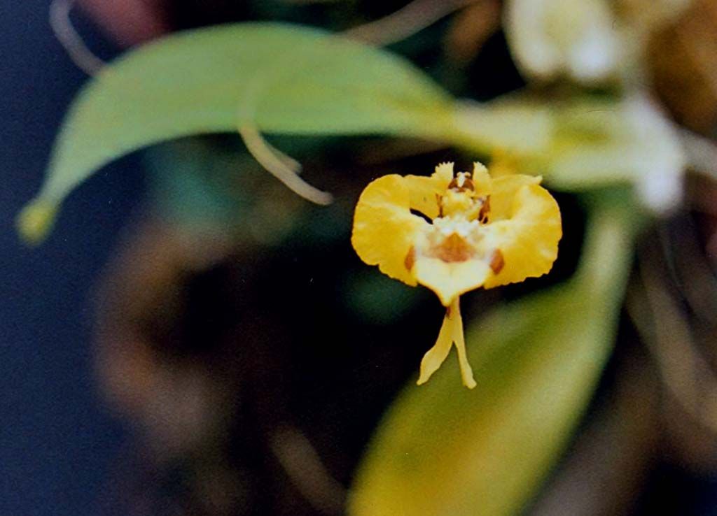 Found in Peru and Ecuador at elevations of 1200 to 2000 meters as a mini-miniature sized, cool growing epiphyte with ovate, strongly laterally compressed, ancipitous pseudobulbs partially enveloped basally by 1 to 2 pairs of opposite, conduplicate non-foliaceous sheaths and carrying a single, apical, lanceolate, obtuse to rounded, gradually narrowing below into the conduplicate base leaf that blooms in the winter on an erect, heteranthous, peduncle longer than the rachis, paniculate, 5 to 6 branched inflorescence with short branches carrying 1 to 2 abortive flowers and a single apical fertile, scentless flower.