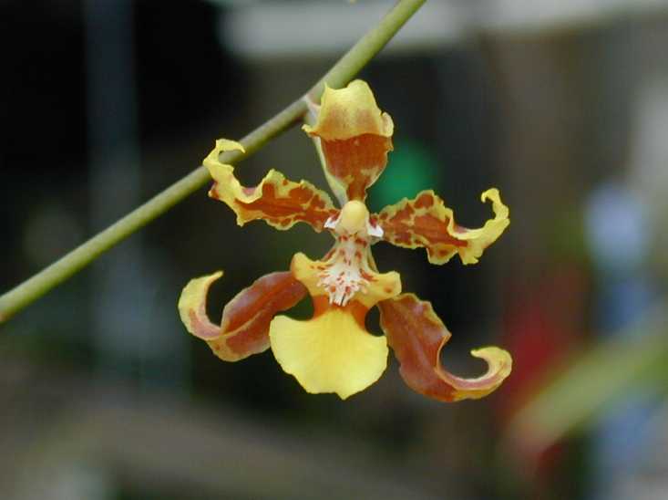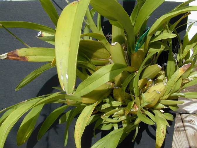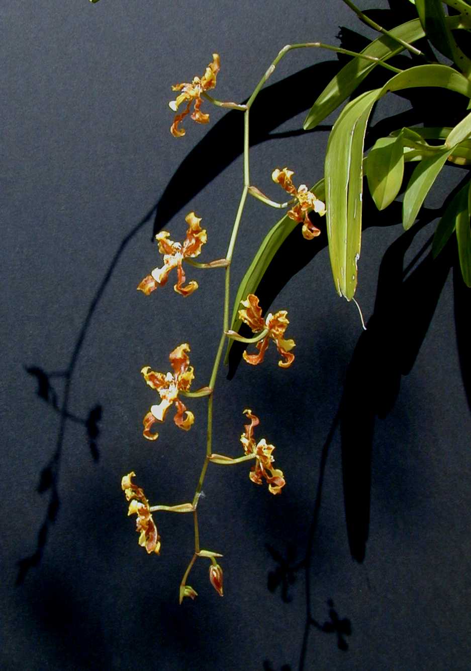 A bifoliate epiphyte with smooth compressed psuedobulbs and with a simple fractifex inflorescence with several flowers.