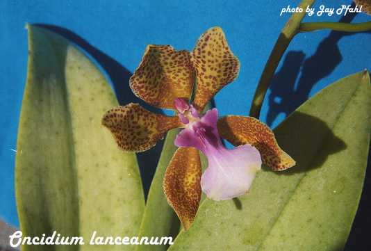 Synonyms Lophiaris fragrans Raf. 1838; Oncidium lanceanum Lindley 1842; Oncidium lanceanum f. aureum Christenson 1991; Trichocentrum lanceanum (Lindl.) M.W.Chase & N.H.Williams 2001
