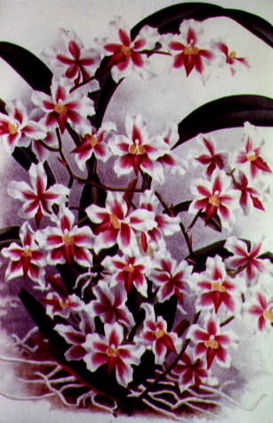 Found in Colombia and Peru in transitional forests in between savannah woods and upland, evergreen woods at elevations of 1300 to 1400 meters as a small sized, cool growing epiphyte with a long creeping rhizome, ovoid-oblong to ovoid-cylindrical pseudobulbs basally enveloped by several pairs of imbricate, leaf-bearing sheaths carrying 1 or 2 apical, oblanceolate, acute, gradually conduplicate below into the base leaves that blooms on a scandent, 100" [2.5 meters] long, many branched towards the apex, to 5" [12.5 cm] long each branch, many flowered inflorescence.