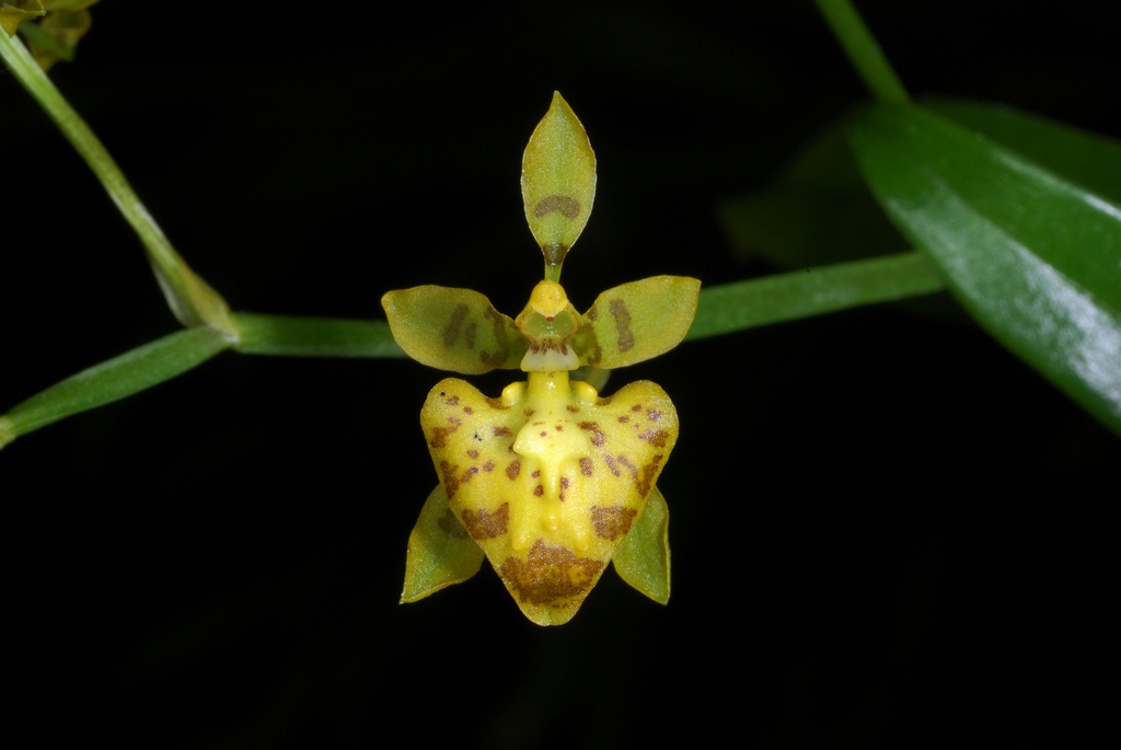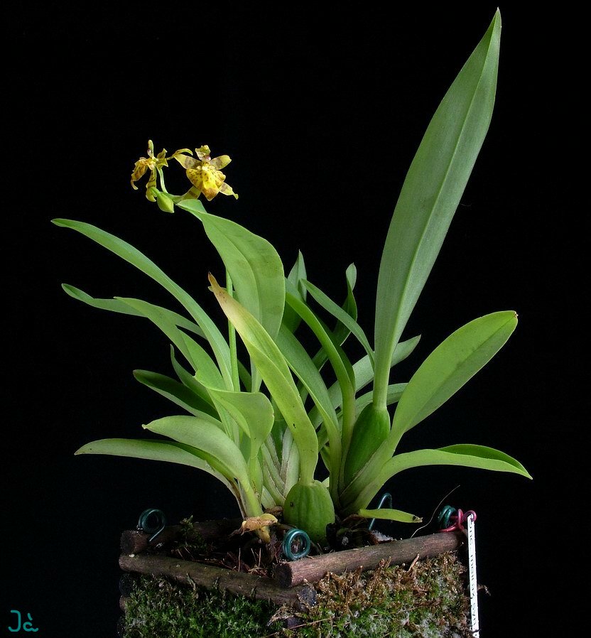 Found in the Dominican Republic, Puerto Rico, the Leeward Islands, Venezuela, Colombia, Ecuador and Peru in humid forests at elevations of 600 to 2000 meters as a small sized, warm to cool growing epiphyte with bright green, oval, compressed psuedobulbs carrying a single, apical, lanceolate, or oblong-lanceolate to linear-lanceolate, acute or obtuse leaf with an attenuate and conduplicate base that blooms in the late winter and early spring on a fractiflex, 3 angled at base in cross-section, to 8" [20 cm] long, racemose or paniculate inflorescence arising from the leaf sheath of a mature pseudobulb that is compressed apically and carries several, successively opening, long-lasting flowers.