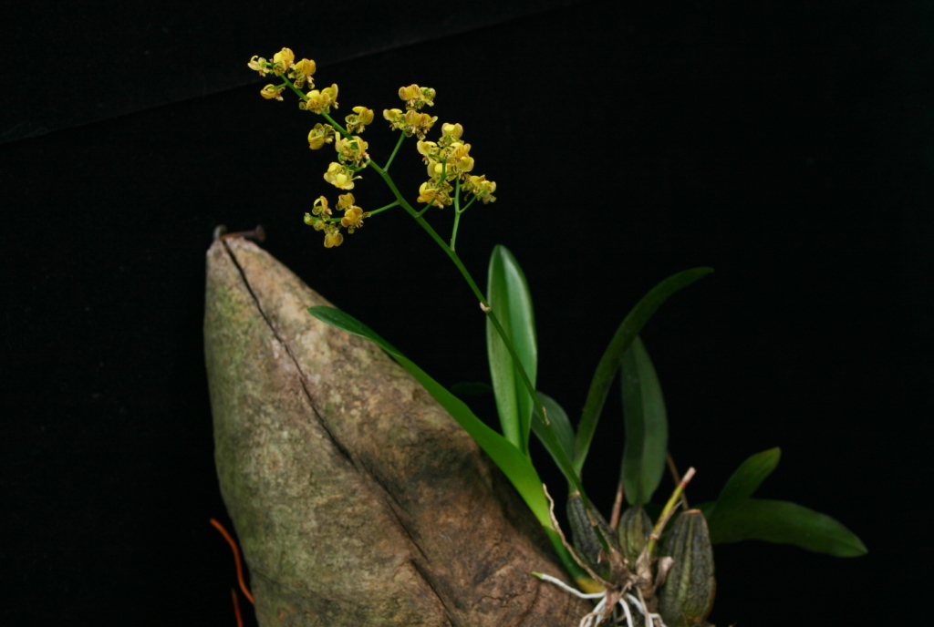 Found in Parana, Santa Catarina and Rio Grande Do Sul states of Brazil, Paraguay and Argentina at elevations around 200 to 1000 meters as a miniature sized, cool to warm growing epiphyte with clustered, elongated to ovate, laterally compressed, ancipitous pseudobulbs that become rugose with age carrying 2 bright green, acute, leathery, conduplicate below into the base leaves that blooms in the summer in nature and early spring in cultivation in Sao Paulo on a basal, paniculate, to 16" [to 40 cm] long, many flowered inflorescence arising on a matured pseudobulb with short, distichously set branches carried towards the apex and carrying fragrant, long-lasting flowers.