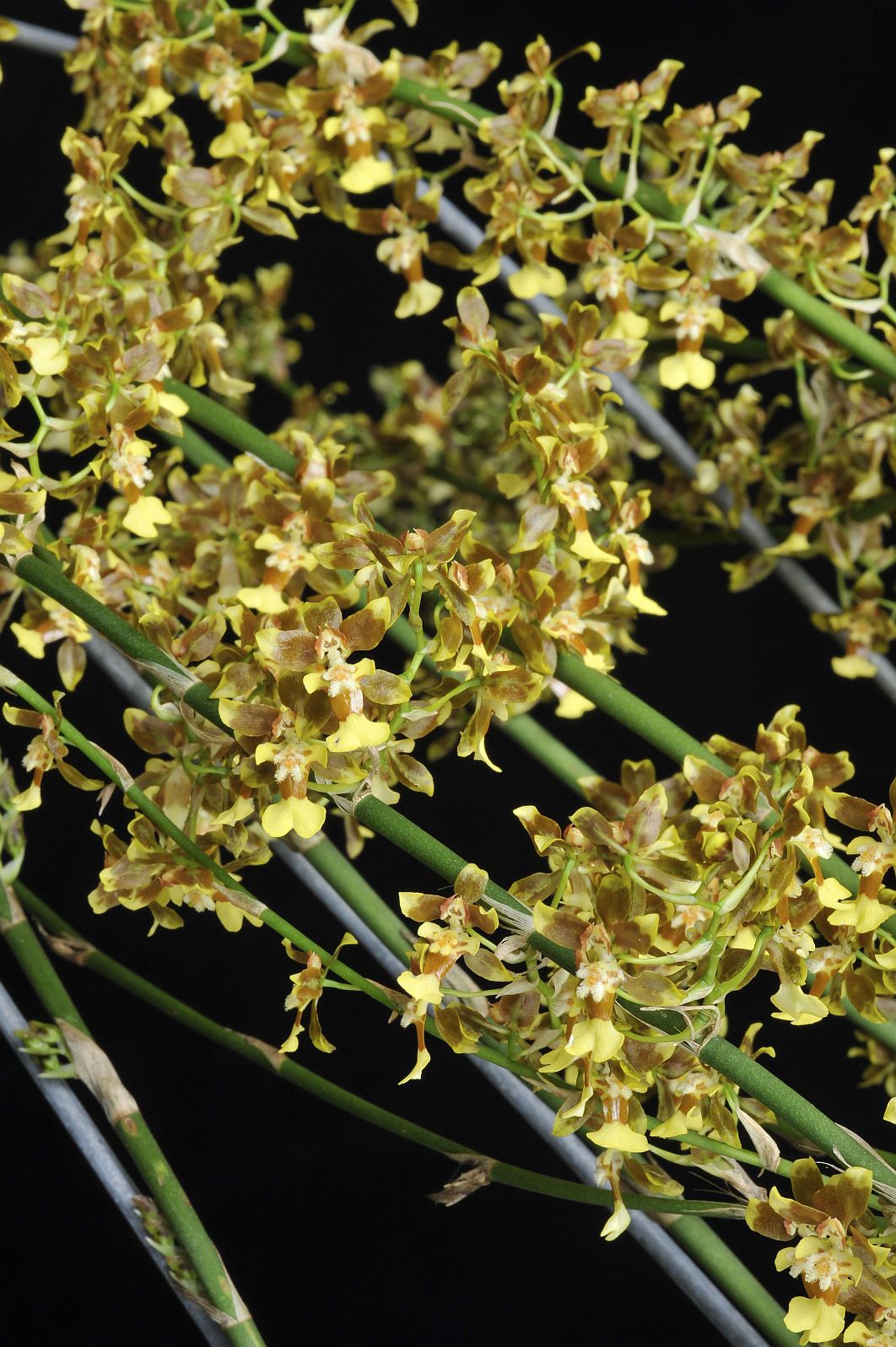 Found in Costa Rica and Panama at elevations of 200 to 1000 meters as a hot to warm growing epiphyte with elliptic to ovoid, laterally compressed, longitudinally grooved and ridged, ancipitous, brown spotted pseudobulbs partially enveloped basally by several, imbricate, leaf-bearing sheaths and carrying two apical, oblong-lanceolate, thin, conduplicate and narrowing below into the base leaf that blooms in the late winter and early spring on an axillary, slender, arching, paniculate, densely many flowered inflorescence that arises on a matured pseudobulb with many alternate branches with a decided bottle-brush look and carrying a few to several, long-lasting, faintly fragrant flowers on each branch.