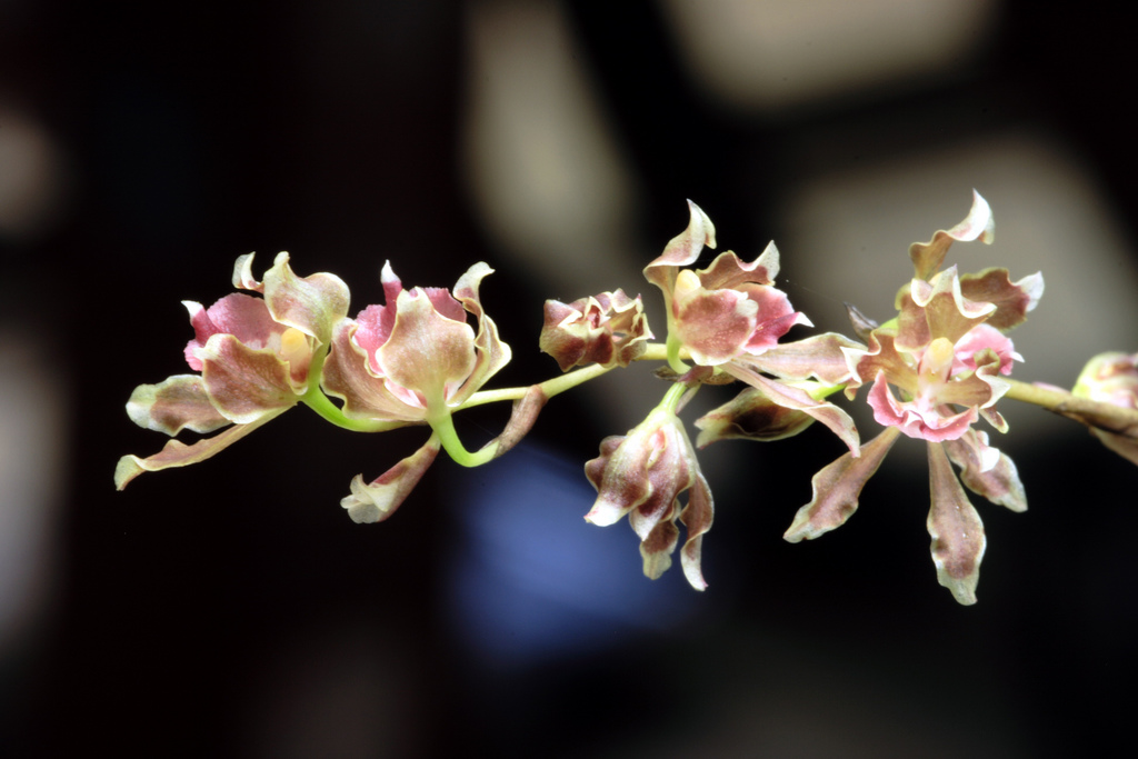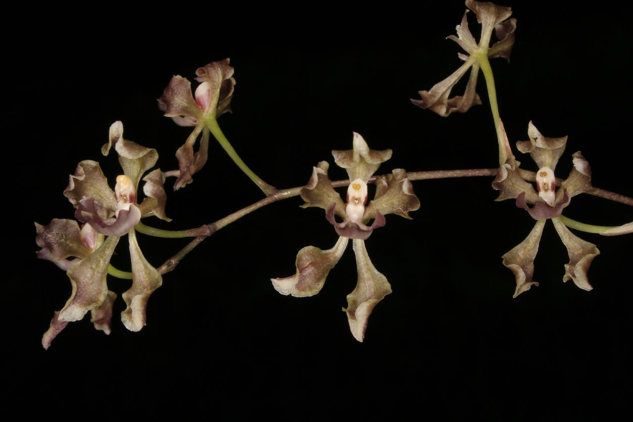 Found in Ecuador at elevations around 1600 meters as a small sized, cool growing epiphyte with an ovate, strongly compressed, ancipitous pseudobulb carrying 2 apical, oblong-lanceolate leaves that blooms on a paniculate, arching to ascending, 3 to 5, short branched each with 2 to 3 flowering below, 12" [30 cm] long, several flowered, racemose above inflorescence