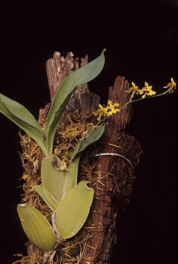 Found in Mexico, Guatemala and Costa Rica in forests at elevations of 1700 to 2000 meters as a small sized, cool growing epiphyte with to 1.2" [3 cm] between each egg-shaped, laterally compressed, ancipitous pseduobulb enveloped partially below by several, distichous, overlapping, sheaths with the uppermost leaf-bearing sheaths and carrying 2, apical, erect spreading, thin, hard, stiff, broadly elliptic to elliptic-oblong, obtuse, narrowing below into the conduplicate base leaves that blooms in the fall on an axillary, racemose to paniculate, weak, straggly, to 39" [100 cm] long, laxly few to several flowered inflorescence arising on a recently matured pseudobulb and has ovate to lanceolate, acute, concave, thin, dry floral bracts.