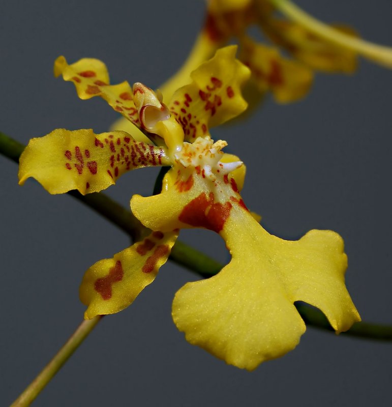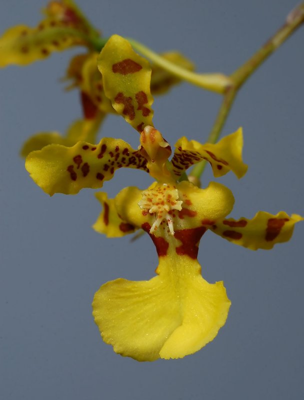 Found in Venezuela, Colombia and Ecuador in premontane and montane forests at elevations of 1000 to 2150 meters as a medium sized, cool to cold growing epiphyte with ovate, shiny, compressed, ancipitous pseudobulbs carrying 1 to 2, apical, oblong-lanceolate, conduplicate below into the base leaves that blooms in the fall on a paniculate, 15 to 20 branched, short and spreading each with 3 to 7 flowers, ascending to erect to arcuate, 24" to 5' 4" [60 to 160 cm] long inflorescence arising through the axils of a inner leaf sheath and carries fragrant flowers scented with honey.