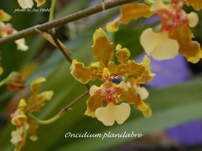 Similar to Onc panamense Schlechter but O planilabre differs in being a smaller plant, and the column is wingless, instead there are 3 downward projecting teeth over the stigma and a .08" [2 mm] long tubercle at the base of the crest. The arrows in the photo point to these teeth and tubercle.