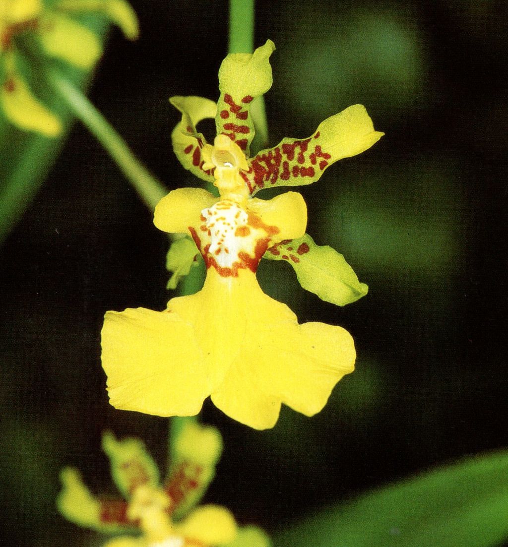 Found in Chiriqui and Verguas provinces of Panama in cloud forests at elevations of 1300 to 1700 meters as a small to medium sized, cool growing epiphyte with narrowly ovate, laterally compressed, ancipitose pseudobulbs almost completely enveloped by large leaf-beaqring sheaths and carrying 1 to 2, apical, oblong-lanceolate, acute, conduplicate below into the base leaves that blooms in the spring and summer on an axillary, sometimes followed after flowering by a second inflorecence on the other side of the pseduobulb, ascending to erect, slightly curved, peduncle distincly longer than the rachis, rachis racemose, occasionally with a single branch, 12 to 16" [30 to 40 cm] long overall, 6 to 8 flowered inflorescence carrying non frgrant flowers.