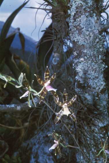 This small to medium sized, cool to cold growing, epiphytic species can be found in Jalisco and Michoacan stses of Mexico at an elevation of 1200 to 2300 meters with broadly ovate, laterally compressed, longitudinally rugose with age pseudobulb carrying 2 or 3, elliptic-lanceolate, rounded to acute, conduplicate below into the petiole-like base that blooms in the winter and spring on a basal, 3 1/2' [105 cm] long, racemose, many flowered inflorescence arising on a mature pseudobulb and carrying showy, widely spread star-shaped flowers.