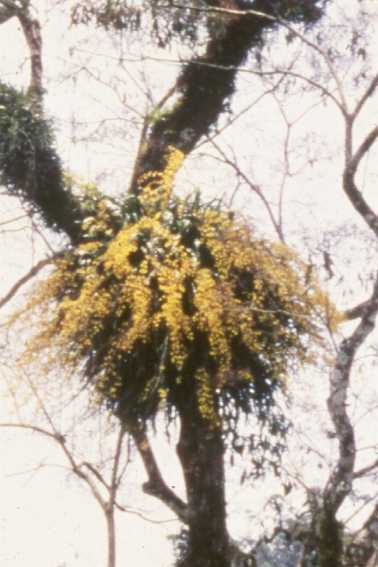 Found in Mexico, Guatemala, Belize, El Salvador, Honduras, Nicaragua, Costa Rica and Venezuela at elevations below 1000 meters as a giant sized, hot to warm growing epiphyte and occasional lithophyte with compressed, oblong pseudobulbs carrying 2 to 3, linear-ligulate, suberect, rigid, acute leaves found in tropical and mountain rain forests occuring and blooms in the spring with a basal, to 6' [180 cm] long, lateral to pendulous, short branched, purple mottled panicle arising from the leaf bearing sheaths of a mature pseudobulb that has triangular bracts and carrying showy, weakly fragrant flowers.