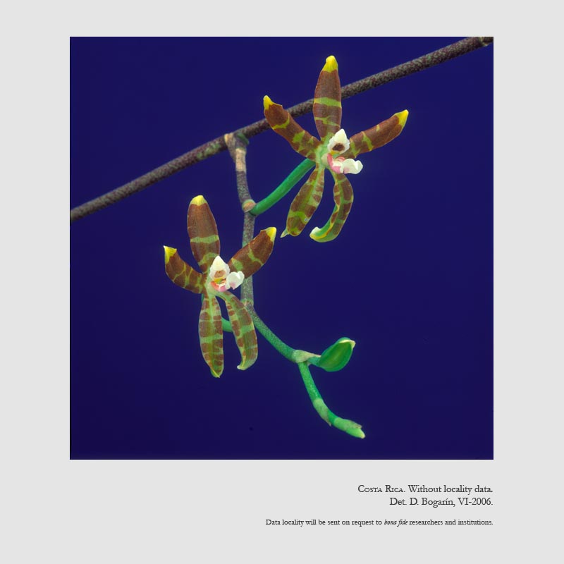 Found in southern Mexico, Guatemala, El Salvador, Honduras, Nicaragua and Costa Rica at elevations around 1800 meters as a medium sized, cool growing epiphyte with clear green, sulcate, compressed, ovoid pseudobulbs enveloped basally by 2 pairs of imbricating, leaf bearing sheaths and carrying 2, apical, narrowly elliptic, strongly carinate, obtuse, conduplicate below into the base leaves that blooms in the spring on an axillary, lateral, green with red spotches, to 42" [110 cm] long, paniculate, many flowered inflorescence.