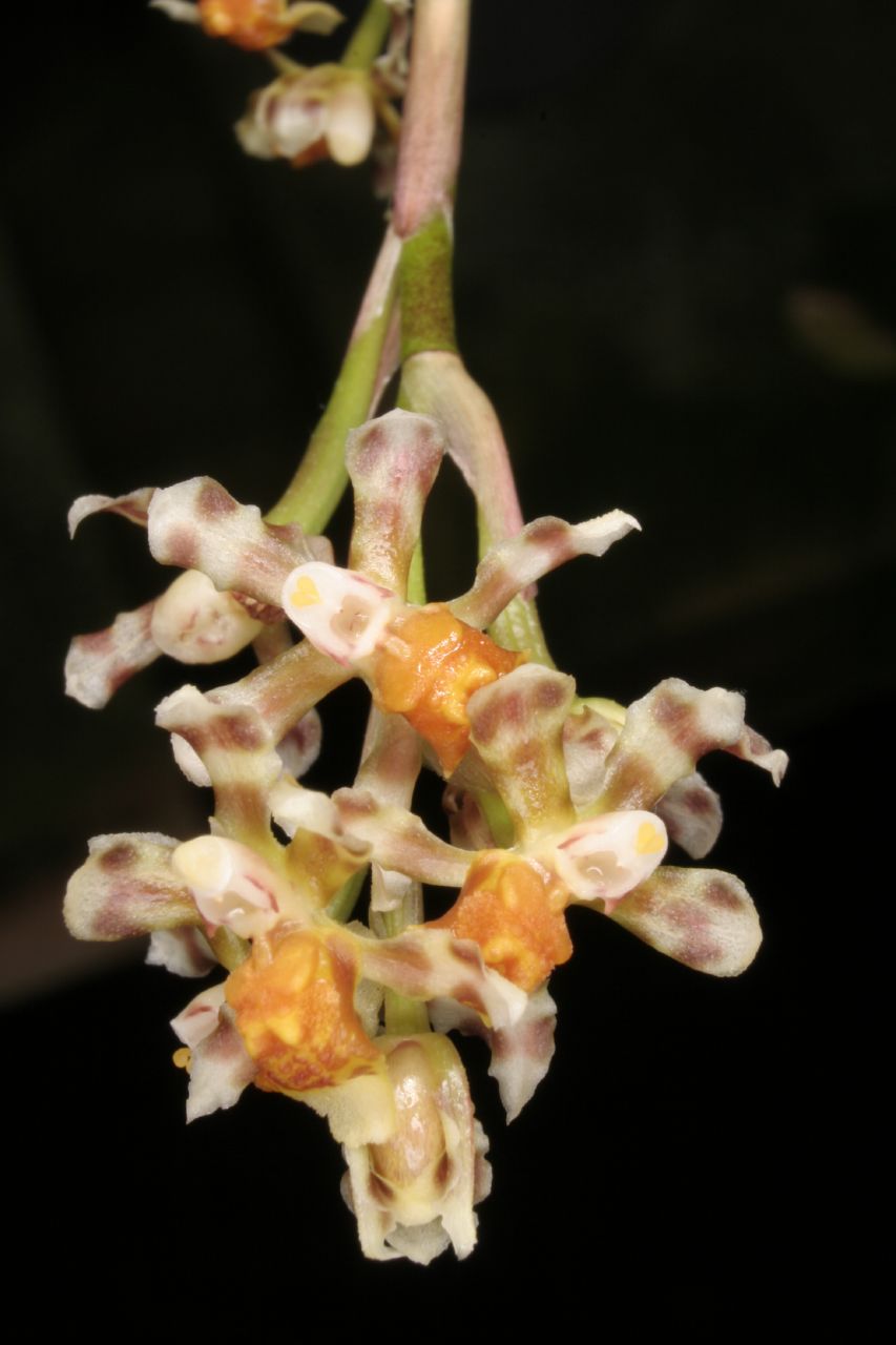 Found in Zamora Chinchipe province Ecuador in very wet, montane cloud forests at elevations of 500 to 1400 meters as a small sized, warm to cool growing epiphyte with oblong, compressed pseudobulbs enveloped basally by several distichous, conduplicate sheaths with the uppermost few being leaf bearing and carrying a single, apical, linear-oblong, acute, narrowing below into a conduplicate petiolate base leaf that blooms in the fall on an erect, paniculate, several to many flowerd, 22" [55 cm] long inflorescence that has many, short branches each subtended by a tubular bract and carrying 3 to 5, faintly fragrant flowers that are often self-pollinating.