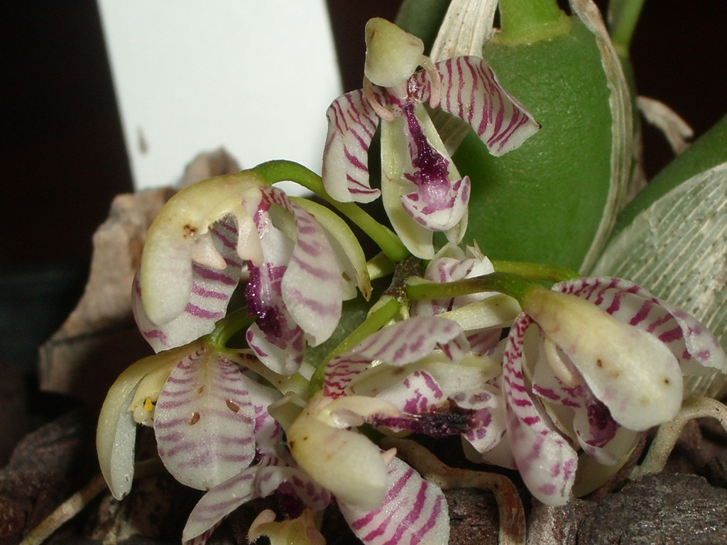 Found in Rio de Janiero state of Brazil and Paraguay in montane rainforests at elevations of 900 to 1200 meters as an odd, miniature, cool growing epiphytic species with conical, slightly compressed, sulcate psuedobulbs with a single, apical, erect or erect-spreading, coriaceous, lanceolate, acute, petiolate leaf that blooms in the fall through early winter on a pendulous, slender, densely several to many [6 to 20] flowered, 4" [10 cm] long, racemose inflorescence with ovate-triangular, acute, greenish white floral bracts and nodding, strongly concave, scentless flowers.