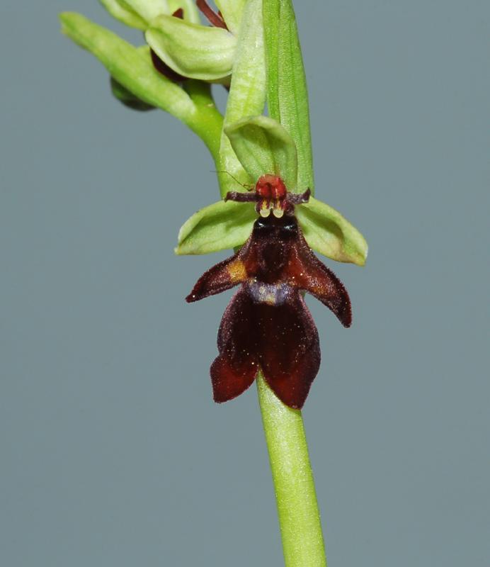 Synonyms Arachnites musciflora (Huds.) F.W.Schmidt 1793; Epipactis myodes (Jacq.) F.W.Schmidt 1795; Malaxis myodes (Jacq.) Bernh. 1800; Ophrys insectifera f. apiculata (M.Schulze) Soó 1970 publ. 1971; Ophrys insectifera f. bombifera (Bréb. ex Rchb.f.) Soó 1970 publ. 1971; Ophrys insectifera f. dubia (Ruppert) Soó 1970 publ. 1971; Ophrys insectifera f. longibracteata (Ruppert) Soó 1970 publ. 1971; Ophrys insectifera f. parviflora (M.Schulze) Soó 1970 publ. 1971; Ophrys insectifera f. rotundata (Ruppert) Soó 1970 publ. 1971; Ophrys insectifera f. subbombifera (Ruppert) Soó 1970 publ. 1971; Ophrys insectifera lus. ochroleuca (E.G.Camus) Soó 1970 publ. 1971; Ophrys insectifera lus. virescens (Ruppert) Soó 1970 publ. 1971; Ophrys insectifera lus. viridiflora (A.Camus) Soó 1970 publ. 1971; Ophrys insectifera var. myodes L. 1753; Ophrys muscaria Scopoli ?; Ophrys muscifera Hudson 1761; Ophrys muscifera f. apiculata M.Schulze 1894; Ophrys muscifera f. bombifera Bréb. ex Rchb.f. 1851; Ophrys muscifera f. dubia Ruppert in W.Zimmerman 1912; Ophrys muscifera f. longibracteata Ruppert 1924; Ophrys muscifera f. ochroleuca E.G.Camus 1908; Ophrys muscifera f. parviflora M.Schulze 1889; Ophrys muscifera f. rotundata Ruppert 1912; Ophrys muscifera f. subbombifera Ruppert 1924; Ophrys muscifera f. virescens Ruppert 1928; Ophrys muscifera f. viridiflora A.Camus 1929; Ophrys myodes [L] Jacquin 1781; Orchis insectifera (L.) Crantz 1769; Orchis muscaria Scop. 1772; Orchis muscifera (Huds.) Salisb. 1796; Orchis musciflora Schrank 1789; Orchis myodes (Jacq.) Bernhard 1800