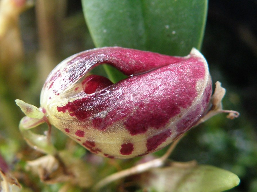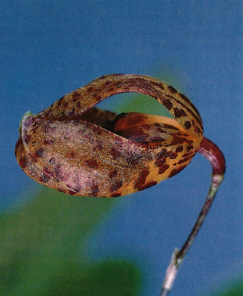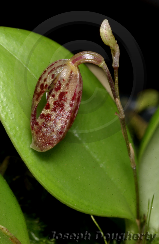 Found in Panama, Colombia, Venezuela, Ecuador and Bolivia in cloud forests at elevations of 200 to 1800 meters as a miniature sized, hot to cool growing epiphyte with short ramicauls enveloped basally by 2 tubular sheaths carrying a single, elliptical, acute, cuneate below into the petiolate base leaf that blooms in the fall on a short, successively single flowered inflorescence arising from the apex of the ramicaul with the flower held near the leaf base.