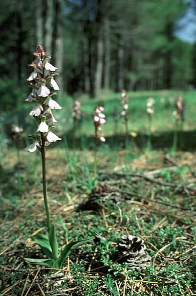 A Spanish small to medium sized, cool to cold growing terrestrial orchid occuring in open woodlands with mostly pine at elevations of 900 to 1900 meters with a slender stem carrying 2 to 6, basal, rarely erect, oval-lanceolate leaves that blooms in the later spring on an erect, terminal, 8 to 25 flowered, racemose inflorescence.