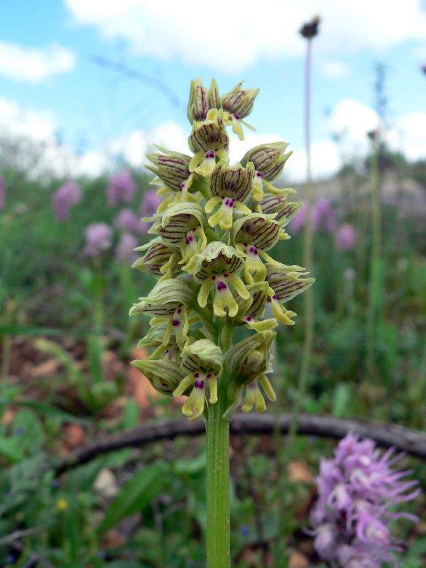 Found in Turkey, Syria, Lebanon, Israel and Jordan at elevations of 100 to 1130 meters in olive groves and scattered oak woodlands as a small to medium szied, warm to cool growing terrestrial with 3 to 8 basal, near erect to spreading, unmarked, pale green, shiny, lanceolate leaves and 1 to 3, smaller cauline leaves that blooms in the winter and spring on an erect, 6 to 16" [15 to 40 cm] long, dense to near laxly 12 to 30 flowered, cylindrical inflorescence carrying musk-scented flowers that open from the apex towards the base