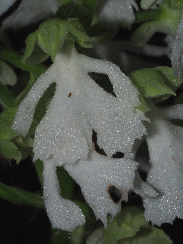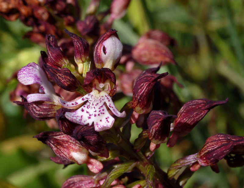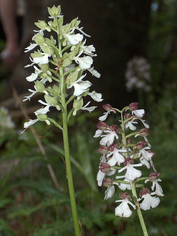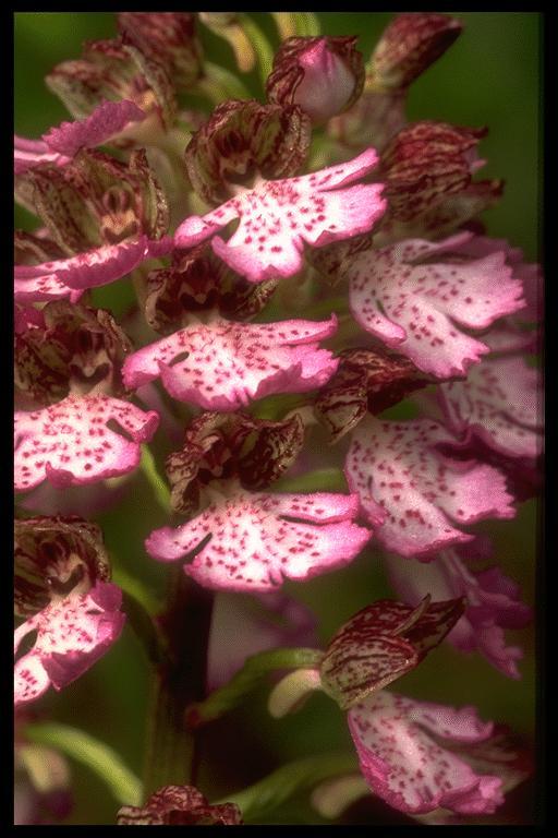 A medium sized, cold growing terrestrial orchid from Great Britain, Algeria, Spain, France, Corsica, Sardinia, Belgium, Netherlands, Germany, Denmark, Czechoslovakia, Austria, Hungary, Switzerland, Italy, Yugoslavia, Albania, Greece, Turkey, Bulgaria, Romania, Poland, Crimea and Ukraine in short grasslands, garrigue, woodland edges and open woodlands at elevations up to 1800 meters with ellipsoid tubers carrying an erect stem with 3 to 6, oblong to oblong-ovate, glossy leaves that blooms in the spring on a 3 to 6" [7.5 to 15 cm] long, densely many [25 to 200] flowered inflorescence that is cylindrical in shape.