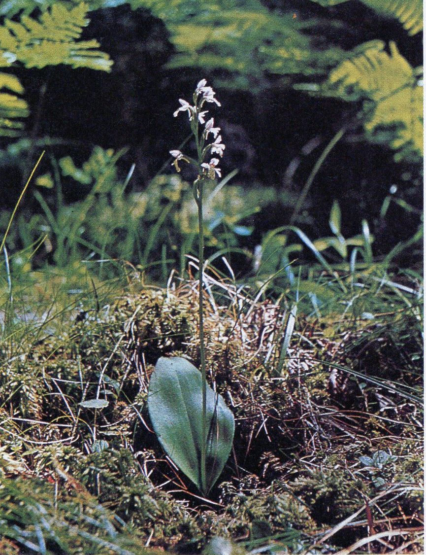 Found as a cold growing terrestrial in western Canada and northeastern USA at elevations of sealevel to 1200 meters with a solitary, ovate to sub-orbicular, basal, fleshy, dull green, indistinctly petiolate base leaf that blooms in the summer on an erect, fluted, naked, to 14" [35 cm] long, to 15 flowered, racemose inflorescence with lanceolate, as long as the ovary floral bracts and carrying simultaneoulsy opening flowers.