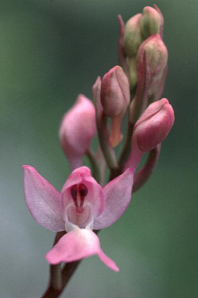A small to medium sized, cold growing terrestrial orchid from France, Spain and Morocco in open woodland and rarely short, poor grasslands at elevations up to 1700 meters with a slender, washed red apically stem carrying 2 to 6 basal, spreading to near erect, in a rosette, usually spotted with violet, oblong-lanceolate leaves with 1 to 4, smaller clasping cauline leaves above that blooms in the spring on an erect, racemose, terminal, cylindrical, lax, 4 to 10" [10 to 25 cm] long, 10 to 35 flowered inflorescence..
