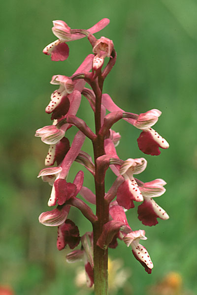 Found on the Islands of Corsica, Elba, the Majorcas and Sicily as well as Algeria and Tunisia in garrigue, maquis and short montane grasslands at elevations up to 2000 meters as a miniature to medium sized, cold growing terrestrial orchid with 2 subglobose tubers carrying an erect stem with 6 to 8, oblong-lanceolate leaves held in a basal rosette that blooms in late winter and the spring on a dense, oblong, 3 to 6" [7.5 to 15 cm] long, laxly flowered inflorescence with lanceolate, veined, tinted green or red floral bracts