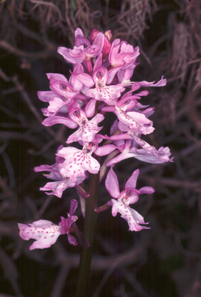 Endemic to Madeira, an island to the west of Morocco and north of the Canary Islands on banks, cliff fissures and scree in rainy trade wind zone at elevations of 1000 to 1800 meteres as a medium to large sized, cool growing terrestrial orchid with a slender, often flexuous, upper half tinted red stem carrying 3 to 5, basal, spreading in a rosette, unmarked, oblong to lanceolate leaves with 2 to 5, smaller, clasping cauline leaves above that blooms in the later spring on an erect, terminal, conical to near cylindrical, near lax, to 4" [to 10 cm] long, 8 to 25 flowered inflorescence.