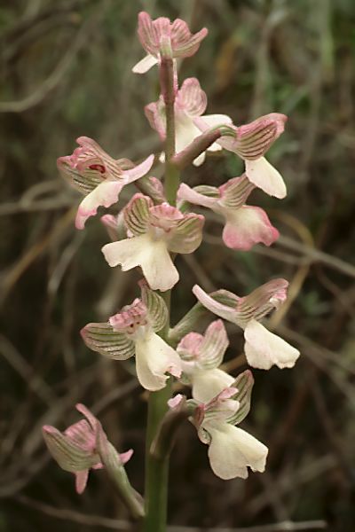 Found in Turkey, Cyprus, Syria and Lebanon in short grasslands, garrigue, olive groves and open woodlands at elevations up to 1300 meters as a miniature to small sized, cool growing terrestrial orchid with to 5 to 9 basal, oblong-lanceolate to oblong-ovate leaves the uppermost becoming leaf sheaths and blooms in the late winter and early spring on a pyramidal, or oblong, 2 to 4" [5 to 10 cm] long, laxly to densely many [5 to 30] flowered inflorescence with the uppermost flowers opening last and lanceolate bracts.