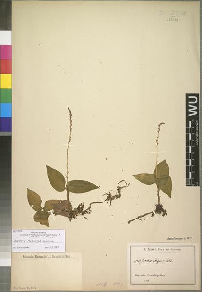 Found in São Tomé, Cameroon and Equatorial Guinea in lowland, hill and gallery forests at elevations of 450 to 1800 meters as a mini-miniature sized, warm to cool growing terrestrial orchid with fusiform pseudobulbs carrying 3 to 4, broadly ovate, ovate to ovate-oblong, apiculate, petiolate base leaves that blooms in the late spring on an erect, terminal, peduncle with 3 to 6 sterile bracts, the rachis 2 to 5.6" [5 to 14 cm] long, 3.2 to 8.8" [8 to 22 cm] long, 30 to 60 flowered inflorescence.