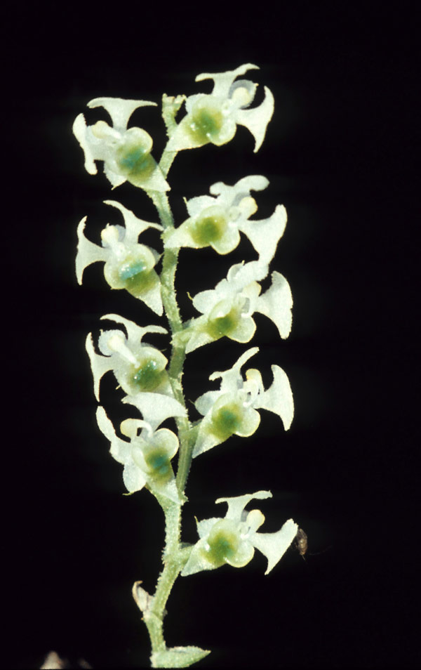 Found in Guatemala, Mexico and El Salvador in open oak forests, deciduous tropical forests or coffee plantations as a small, epiphytic, hot to cool growing species at altitudes up to 1200 meters with fan-shaped, linear-ensiform, fleshy, acute to acuminate leaves that blooms in the summer on an erect, slender, axillary, to 3" [4 to 8 cm] long, racemose, laxly many flowered inflorescence that has a zig-zag rachis and suborbicular-cordate, keeled on reverse, erose ciliate floral bracts and small, white flowers.