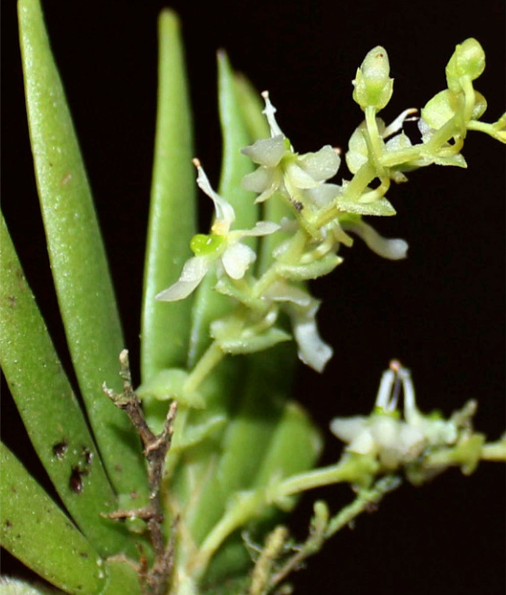 Found in Honduras, Nicaragua and Costa Rica in very wet, pluvial and cloud forests at elevations of 900 to 1550 meters as a miniature sized, warm to cool, pendent growing epiphyte with held in a fan, narrowly elliptic, subfalcate acute leaves that blooms in the summer and fall on an axillary, pendent, 1.8 to 2.8" [4.5 to 7 cm] long, rachis carinate, the quills erose, many flowered inflorescence with oblong-lanceolate, cordate, acute, glandular-erose margined floral bracts and carrying white flowers.