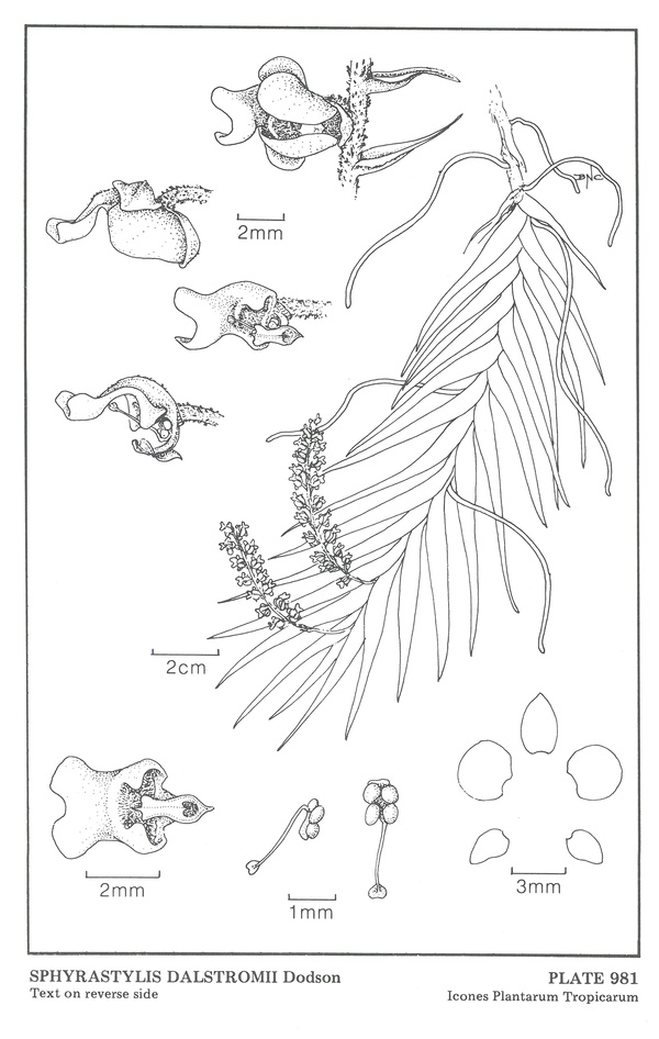 References W3 Tropicos, Kew Monocot list , IPNI ; *Icones Plantarum Tropicarum Plate 981 Dodson 1984 as Sphyrastylis dalstromii drawing fide; Orchids Travel By Air A Pictoral Safari Mulder, Mulder-Roelfsema and Schuiteman 1990 as Sphyrastylis dalstromiiphoto fide; Rudolf Schlechter Die Orchideen Band 1B lieferung 30 1841 - 1904 Brieger 1994