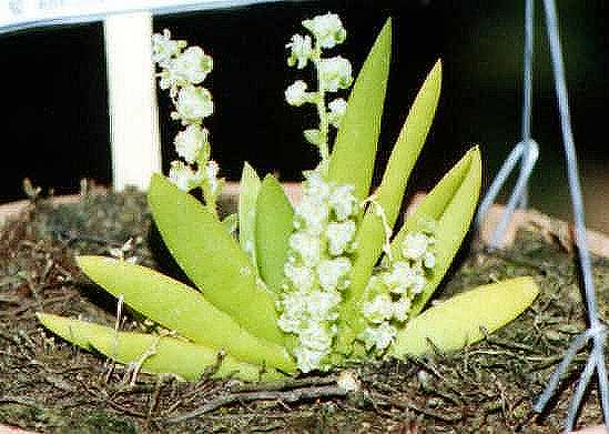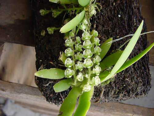 Found in Panama and Colombia at altitudes of 600 to 1000 meters as a mini-miniature to small sized, warm growing epiphyte with a fan of narrowly elloiptic-oblong to broadly ensiform, acute to obliquely acute, articulate below into the oblong, persistent, conduplicate base leaves that blooms in the in the winter and spring on an erect, 4 1/2" [12 cm] long, racemose few to several flowered inflorescence.