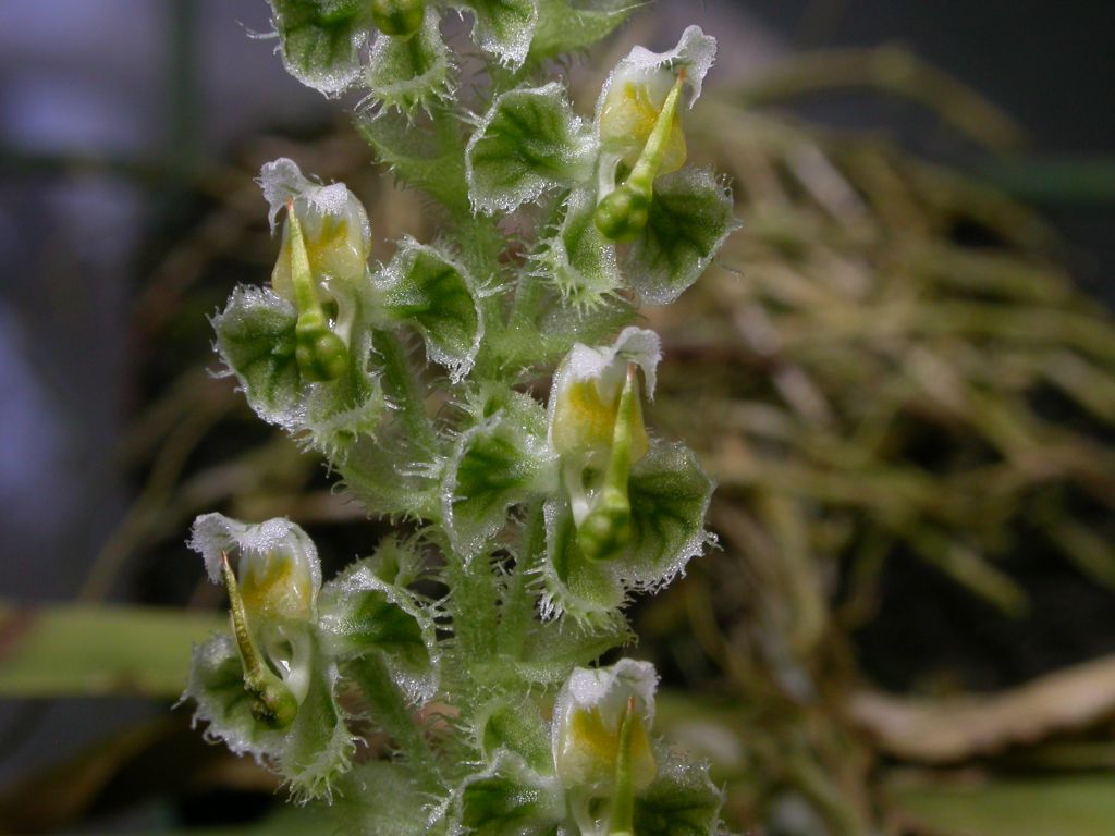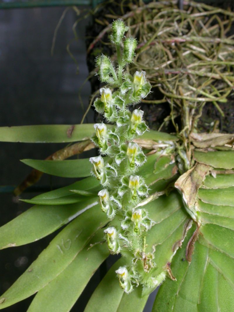 Found in Ecuador, Peru and northern Brazil at elevations of 130 to 1000 meters as a miniature sized, hot to warm growing epiphyte with fan-shaped growths and equitant, bilaterally compressed, linear-lanceolate, acuminate leaves that blooms in the winter and spring on an axillary, 3" [7.5 cm] long, racemose, several to many flowered inflorescence.