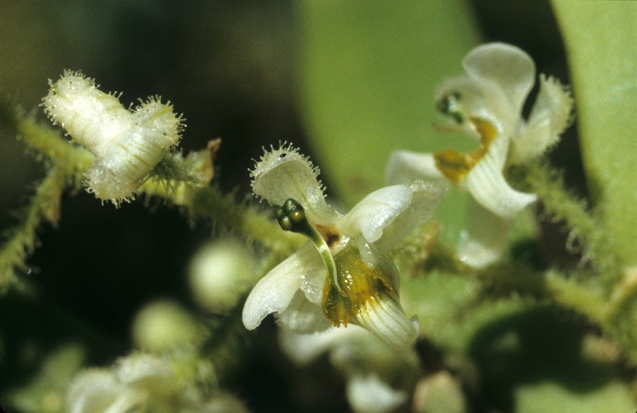 Found in Cochabamba Bolivia in tropical wet forests at elevations around 550 meters as a miniature sized, hot to warm growing epiphyte with an abbreviate stem enveloped completely by imbricating leaf sheaths carrying 10 to 11, distichous, dorsalventrally flattened, in a fan, subfalcate, fleshy leaves that blooms in the winter on an axillary, suberect, to 4" [10 cm] long, racemsoe, hirsute, 6 to 8 flowered inflorescence with small hisute floral bracts.