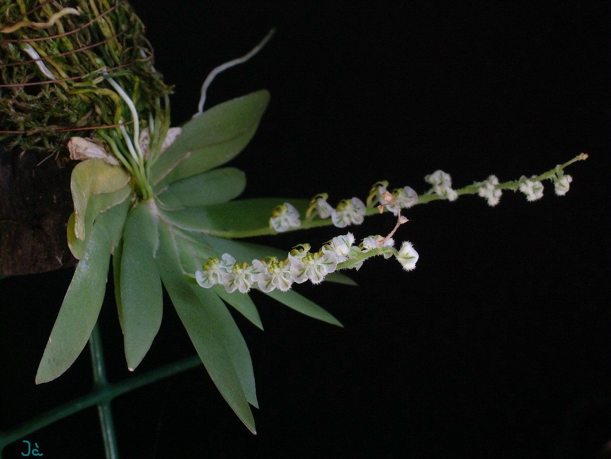 This very small, fan-shaped, hot to cool growing, twig epiphyte is from Trinidad, Venezuela, Brazil, Colombia, Ecuador, Peru, and Bolivia growing on old citrus trees and shrubs in montane rain forests and can be found between the altitudes of 200 and 2200 meters with distichous, arranged in a fan, oblong-lanceolate, conduplicate, compressed, acute leaves that are articulated into the conduplicate leaf-base that blooms in the fall on an erect, 1 1/4" [3 cm] long, axillary, racemose, several flowered inflorescence that is the length of the leaves or shorter.