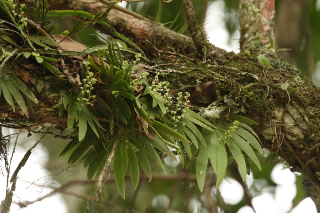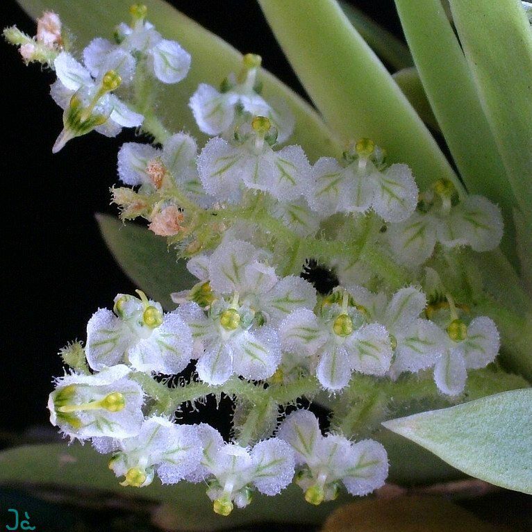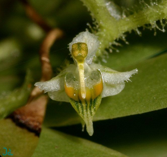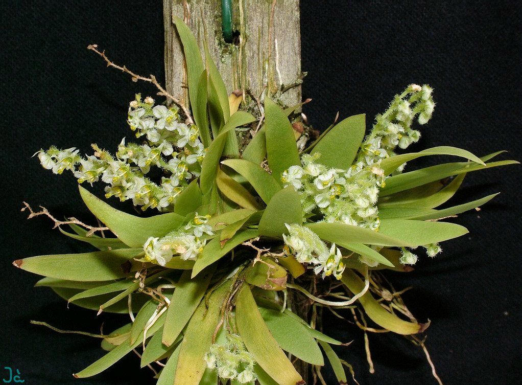 Found in Bolivia and Minas Gerais, Rio de Janiero, Sao Paulo, Parana, Santa Catarina and Rio Grande Do Sul states of Brazil in cool, moist montane forests to dry savannahs and hot lowlands as a miniture to small sized, hot to cool growing epiphyte with no pseudobulbs and the several leaves held in a flat fan-shape with fleshy, falcate, acute leaves that blooms on an axillary, pubescent, 1.6 to 3.2" [4 to 8 cm] long, densely to 15 flowered inflorescence carrying lemon-scented flowers.
