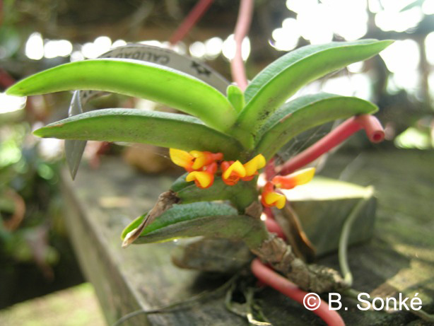 Found in southwestern Cameroon on thick branches in primary forests as a mini-minature sized, warm to cool growing epiphyte with a short, erect, leafy stem enveloped completely by imbricating, leaf-bearing sheaths carrying, 2 ranked, thick and fleshy, oblong-lanceolate, obliquely and obtusely bliobed apically leaves that blooms on axillary, 3/4" [1.8cm] long, 9 to 15, densely flowered inflorescence.