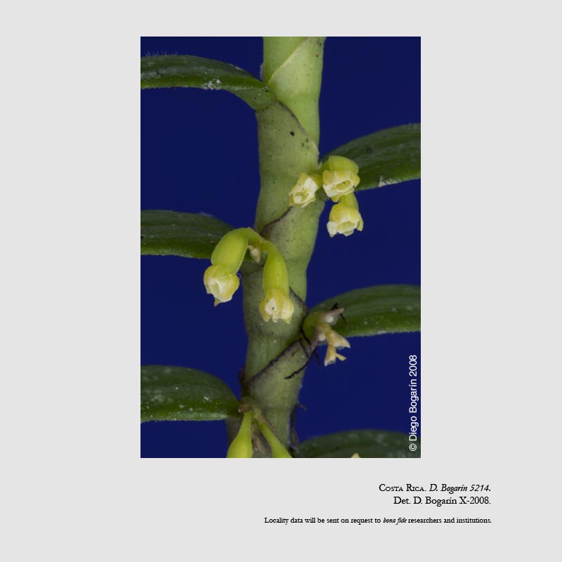 Found in Costa Rica, Panama, Colombia, Venezuela, Ecuador and Peru on scrubby trees at elevations of 3000 to 4000 meters as a miniature to small sized, cold growing epiphyte with a scandent stem enveloped by loose, imbricate leaf-bearing sheaths and carrying fleshy, elliptic-ovate, apiculate leaves with hispidulous margins that blooms in the summer and fall on a short, lateral, racemose, 3 to 5 flowered inflorescence with minute flowers.