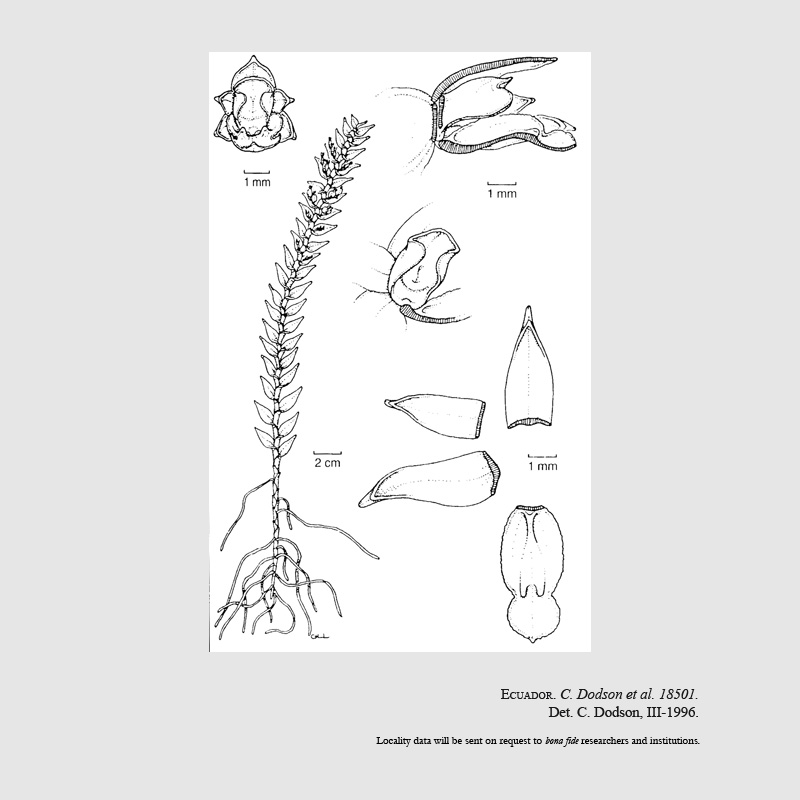 Found in Ecuador at elevations around 3200 to 3300 meters as a small to just medium sized, cold growing epiphyte with a monopodial, basally branching stem enveloped by imbricate leaf sheaths carrying fleshy, spreading, ovate, entire, mucronate-apiculate apically, narrowing below into the clasping base leaves that blooms in the winter on an axillary, to .6" [1.5 cm] long, 4 to 6 flowered inflorescence with awl shaped floral bracts and carrying, small, fleshy, campanulate, probably yellow green flowers.