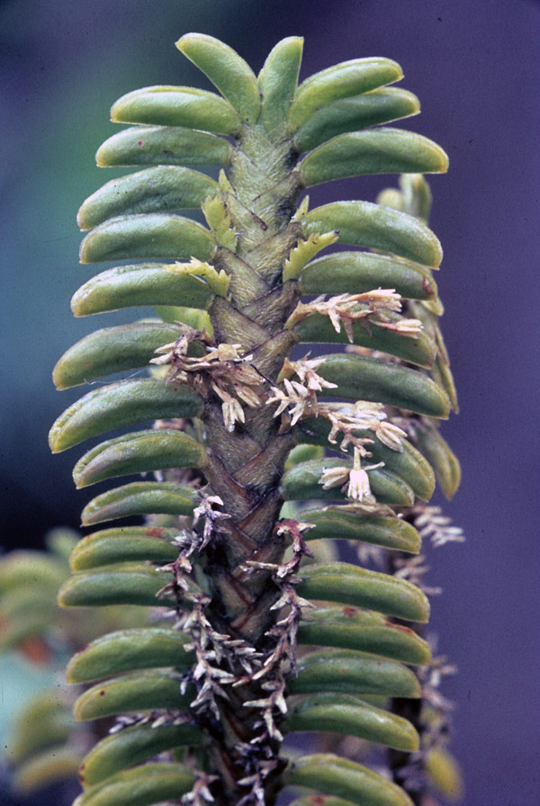 Found in Ecuador in wet cloud forests at elevations of 2800 to 3450 meters with very cold nights as a miniature sized, cold growing epiphyte with a branching stem enveloped completely by imbricate leaf sheaths carrying short, reclining, falcate, conduplicate, channeled leaves that blooms on axillary, racemose, as long as the leaves, few flowered inflorescence carrying simultaneous, small, pale yellow with a red anther flowers
