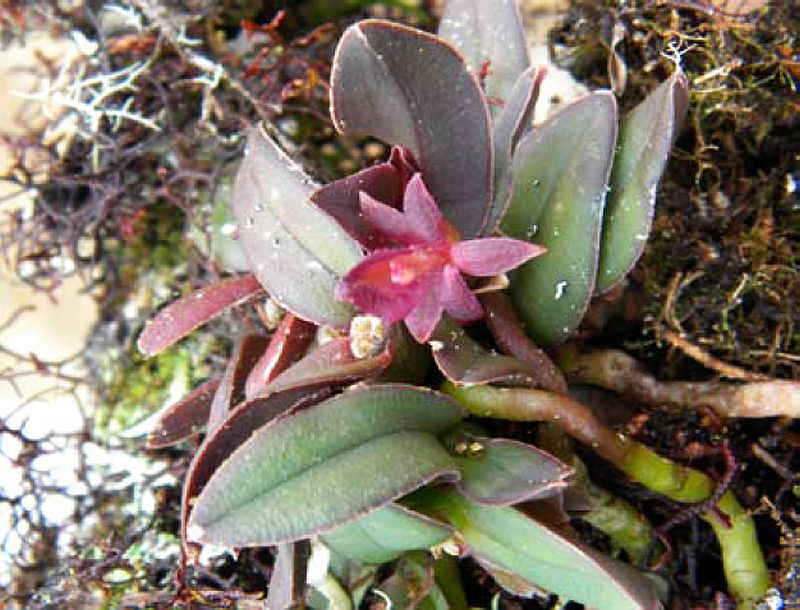 Found on the Cordillera Central in Valle de Cauca Department of Colombia in cloud forests on small isolated shrubs at elevations around 3300 to 3600 meters as a mini-miniature sized, cold, rhizomatosus growing epiphyte with aggregate, thickened, forming globose, homoblastic pseudobulbs carrying 1 to 2, apical, not articulate, coriaceous, dark green tinged with violet towards the nargins and underside, juvenile leaves burgundy red, elliptic, acute, margin hyaline, spreading erose leaves that blooms in the early winter on a terminal, without a spathe, sessile, rachis very short, thick, successively 2 to 3 flowered inflorescence with very small, triangular, obtuse floral bracts and carrying resupinate, reddish violet flowers with the column and disc of the lip yellowish red.