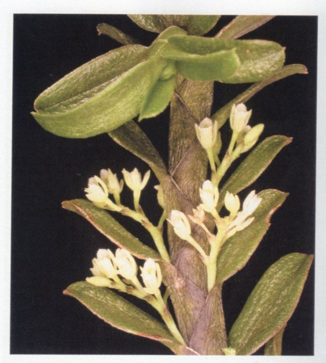 Found in Ecuador in very wet montane forests at elevations around 2500 to 2900 meters as a small sized, cold growing epiphyte with a pendent stem enveloped by imbricate leaf sheaths carrying short, spaced out, falcate, elliptic leaves that blooms on a shorter than the leaf, racemose, successively few flowered inflorescence.
