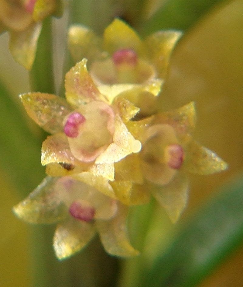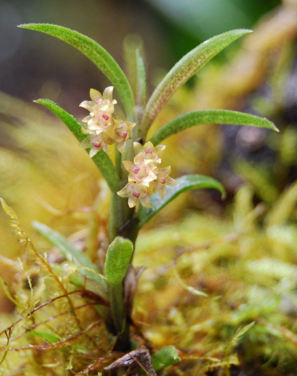 Found in Cundinamarca department of Colombia at elevations around 2950 to 3100 meters as a mini-miniature sized, cold growing epiphyte with an erect stem enveloped completely by imbricate leaf-bearing sheaths carrying distichous, alternate, acute, with finely ciliate margins, dark green with red spotted leaves that blooms on 1 to 2, axillary, .2" [5 mm] long, 3 to 4 flowered inflorescence with relatively large bracts.