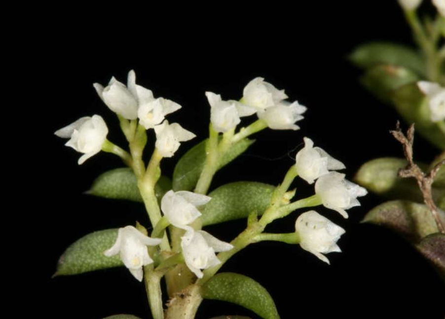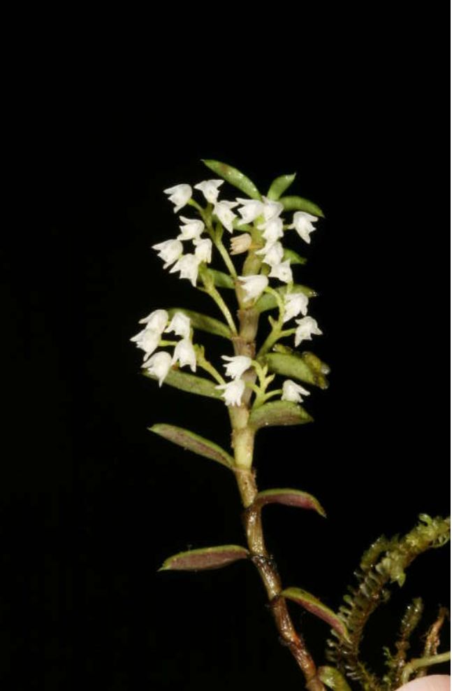 Found in Ecuador and Peru at elevations of 2460 to 3500 meters as a mini-miniature to miniature sized, cold growing epiphyte or lithophyte with erect to more or less arcuate, simple to sparsely branched, rather slender, densely to loosely many leaved stem enveloped entirely by longitudinally nervose leaf sheaths carrying conduplicate, recurved, oblong-acuminate, apiculate, the anterior margin minutely denticulate leaves that blooms on a racemose, shorter than the leaves, few flowered inflorescence with triangular to triangular-lanceolate, much shorter than the ovary floral bracts carrying very small, campanulate, white to ivory colored flowers.