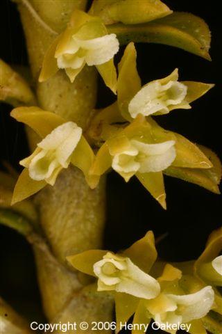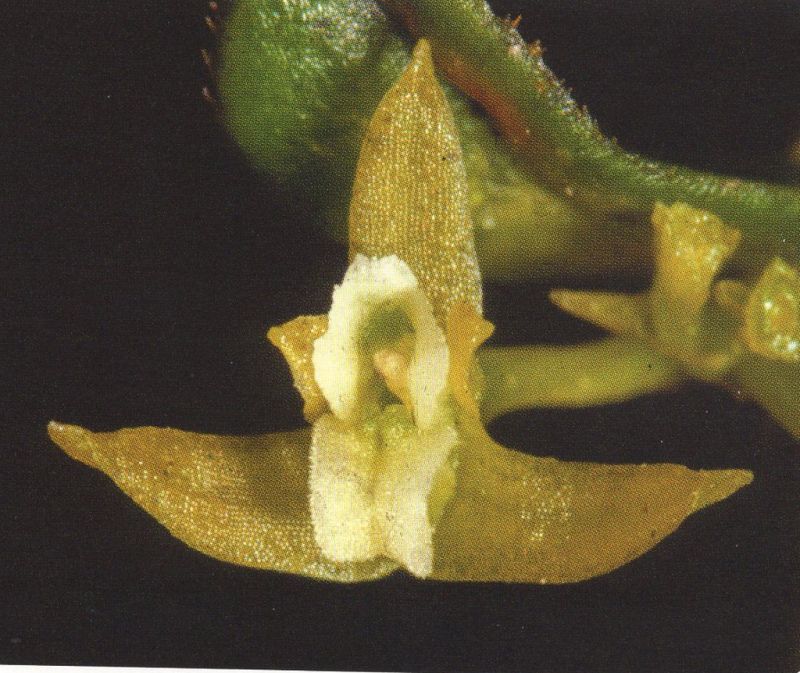 Found in Colombia and Ecuador at elevations of 2450 to 3500 meters as a cold growing epiphyte with ascending, basally branching stems enveloped completely by imbricate leaf sheaths carrying, short, elliptic-oblong, obtuse leaves that blooms on shorter than the leaves, racemose, simultaneously few flowered inflorescence carrying small flowers.